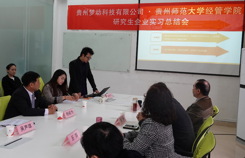 会上,贵州梦动科技有限公司校企合作部经理赵永红、企业指导老师吴声雄及梁正云等,分别就企业实训基地发展现状、研究生实习方案的执行、企业指导老师的工作及公司研究生的实习情况做了详细介绍,并对公司研究生在该公司的实习表现给予充分的肯定和赞扬。吴寓娇代表实习同学对他们的实习作了汇报。