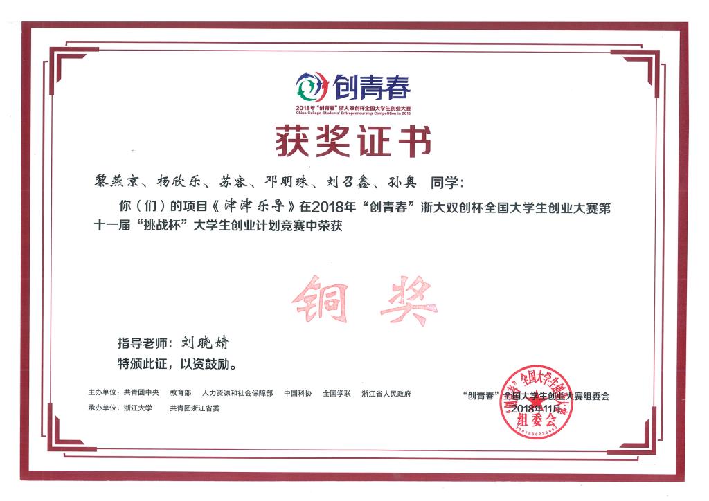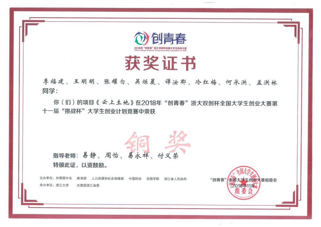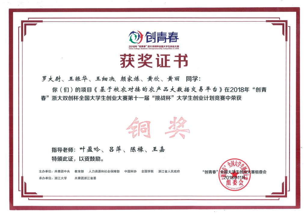 11月3日,由共青团中央、教育部、人力资源和社会保障部、中国科协、全国学联、浙江省人民政府主办,浙江大学、共青团浙江省委承办的2018年“创青春”浙大双创杯全国老员工创业大赛第十一届“挑战杯”老员工创业计划竞赛终审决赛在浙江大学落下帷幕。由公司刘晓婧老师指导,黎燕京等同学完成的项目《津津乐导》,由叶盈吟、吕萍、陈椽、王嘉老师指导,罗大尉等同学完成的项目《基于校农对接的农产品大数据交易平台》,由易静、周怡、易永祥、付义荣老师指导,李福建等同学完成的项目《云上土地》在大赛中荣获铜奖。