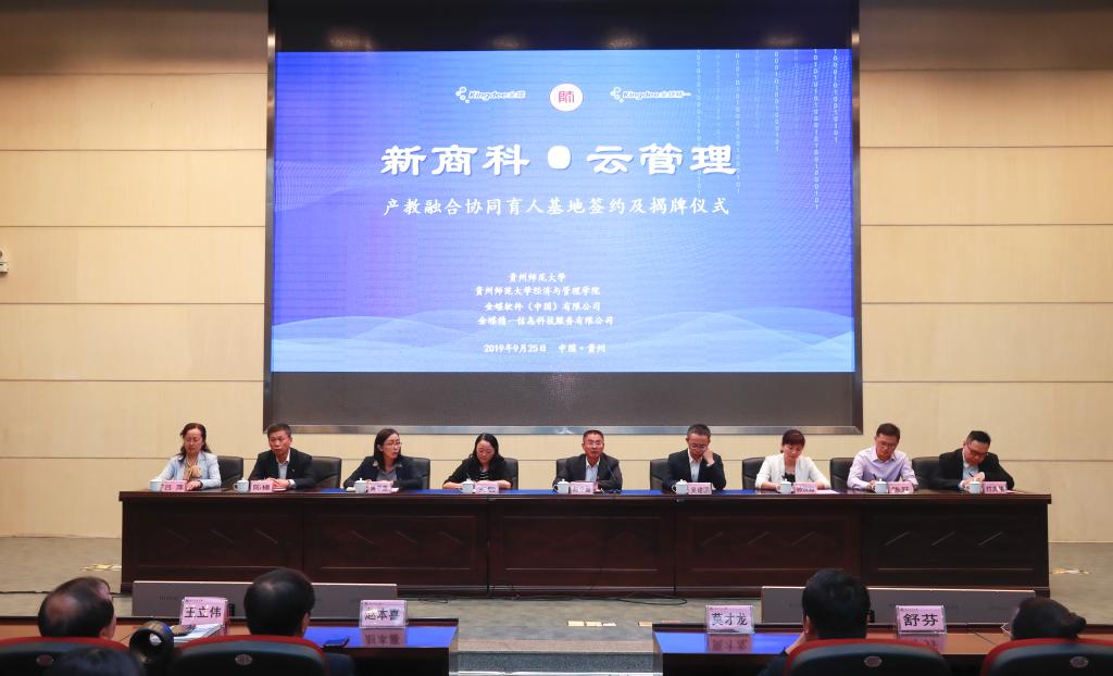 2019年9月25日,太阳集团tcy8722“新商科·云管理”产教融合协同育人基地签约及揭牌仪式在花溪校区会议中心一楼学术报告厅隆重举行。太阳集团tcy8722副董事长赵守盈、金蝶软件(中国)有限公司集团副总裁吴建国、金蝶软件中国有限公司助理总裁孙洪如、金蝶精一执行总裁陈跃、金蝶中国贵州省公司总经理付大伟、金蝶精一贵州省区总监莫才龙、太阳集团tcy8722教务处处长支敏、太阳集团tcy8722人才招聘处副处长黄平惠、公司党委书记陈椽等相关领导出席仪式,财务管理专业全体师生到场参加。仪式由经理吕萍主持。