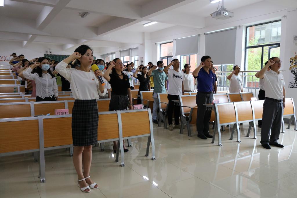 大会在全体师生饱含深情的国歌声中拉开序幕。随后,进行新党员入党宣誓和老党员重温入党誓词活动。无论是在现场还是隔着屏幕,党员同志们都怀着无比崇敬的心情,面对鲜红的党旗,举起右拳庄严宣誓:“我志愿加入中国共产党,拥护党的纲领……”句句铿锵有力,字字掷地有声,体现出一心一意听党话、坚定不移跟党走的信心和决心。