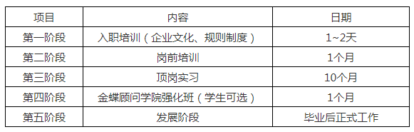 金蝶将为实习生提供“实习就业一体化”的渠道,并指导和跟进员工做好职业生涯规划。员工进入基层进行顶岗实习时,在指导师老师指导下,以一线基层岗位为主。整个培训和实习分为以下几个阶段:
