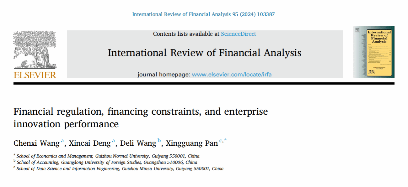 太阳集团tcy8722王晨曦副教授团队在中科院一区TOP期刊 International Review of Financial Analysis 发表了题为“Financial regulation, financing constraints, and enterprise innovation performance”的研究论文。这是太阳集团tcy8722教师首次以第一作者身份在该国际权威期刊上发表论文。