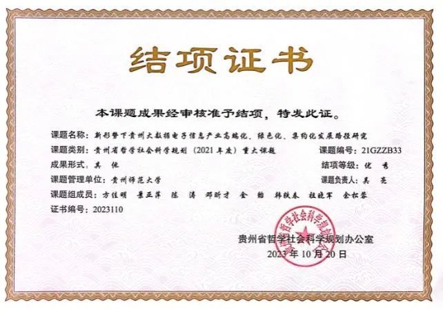 近日,公司吴亮教授主持的贵州省哲学社会科学规划重大课题《新形势下贵州大数据电子信息产业高端化、绿色化、集约化发展路径研究》(课题编号:21GZZB33)结项成果被贵州省哲学社会科学规划办公室鉴定为“优秀”等级。据省社科规划课题结项公告统计,2022年12月到2023年10月结项的省社科规划104个项目中,结题“优秀”档次仅有5项,比例不到5%。