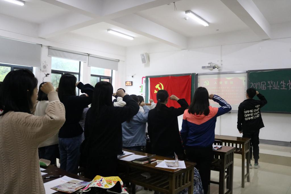最后,全体党员起立,举起右手面向党旗庄严宣誓,重温了入党誓词。