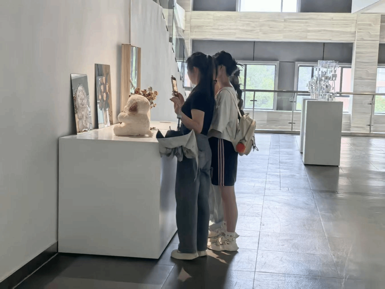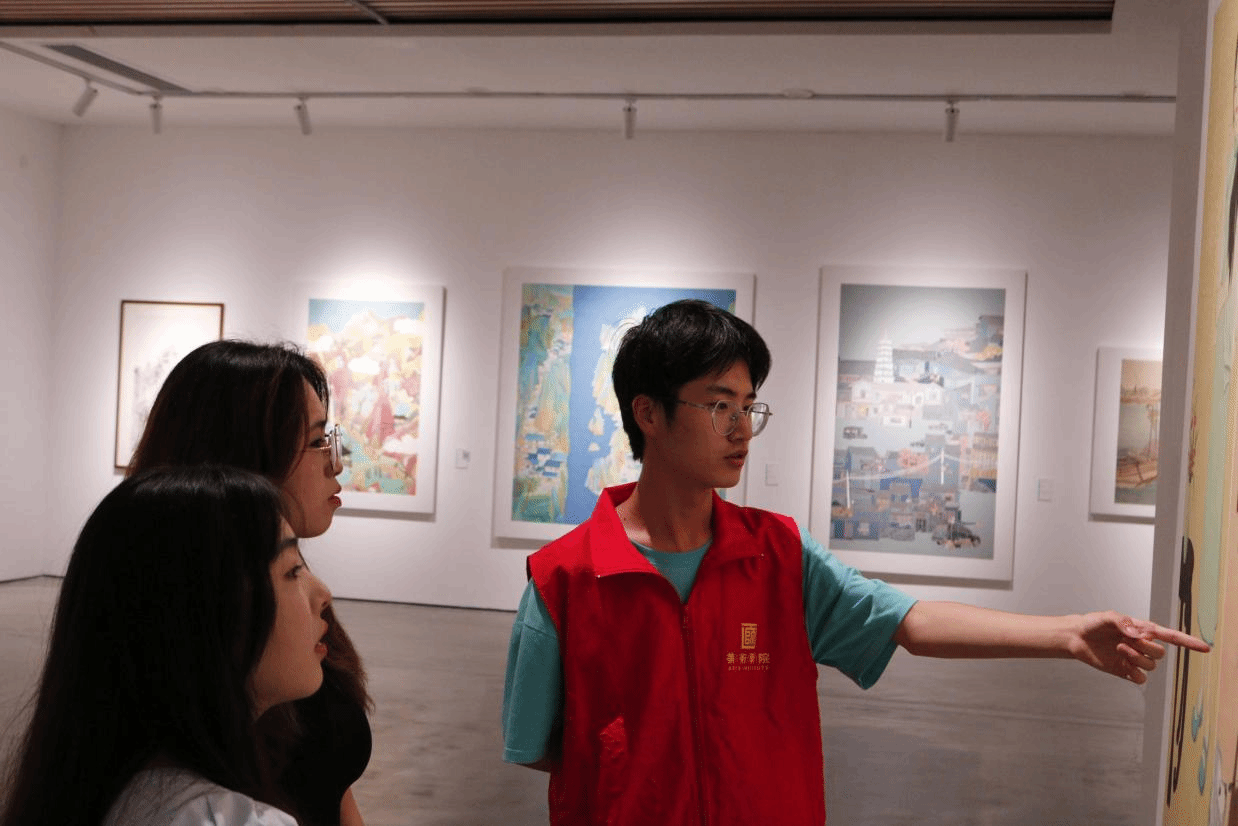活动中,两院师生在专业讲解员引导下,参观了校美术馆展厅。展品涵盖传统水墨的雅致意境、现代装置的先锋表达、写实画作的细腻笔触以及抽象艺术的思维探索,构建出多元的美学空间。同学们驻足欣赏、积极交流,不仅探讨艺术技法与语言,更结合经济管理专业视角,就“艺术市场价值”、“创意产业管理”等话题展开跨界讨论,展现了经管学子融合人文素养与专业知识的创新思维。