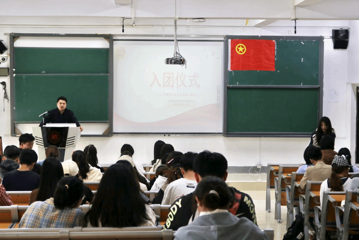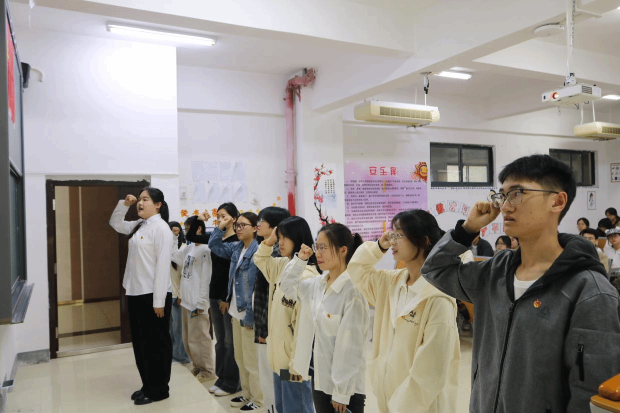 仪式在庄严的国歌声中拉开序幕。主持人宣读了新团员名单后,团干部代表郑重地为新团员颁发团员证、佩戴团徽。随后,在员工会负责人陈思同学的带领下,全体新团员面向鲜艳的团旗,高举右拳,庄严宣誓。“我志愿加入中国共产主义青年团……”铿锵有力的誓言在教室回荡,彰显着新时代青年的坚定信念与责任担当。