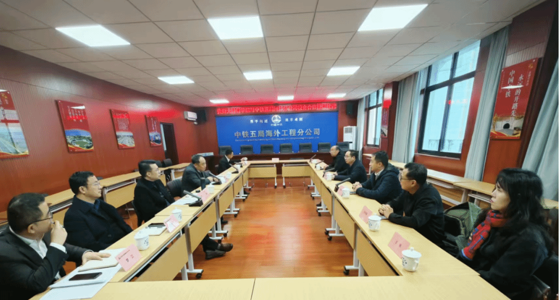 2025年1月15日上午,为深化校企合作与产教融合,公司与中铁五局集团有限公司海外工程分公司在海外工程分公司总部会议室联合举办了校企合作人才建设座谈会及签约授牌仪式。
